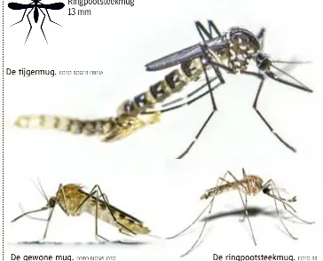 Hierdoor moet de mug extreem alert zijn en zuigt zij zich niet in één keer vol, zoals veel andere steekmuggen, maar vliegt zij van gastheer naar gastheer om zo het bloedmaaltje te verzamelen. Gewone steekmug (culex pipiens l.) orde: Zoals net vermeld komt de tijgermug nog niet voor in nederland. De gelekoortsmug, die vooral overdag steekt, is 3 tot 4 millimeter groot. De mug lijkt enorm op een normale mug. De tijgermug is te herkennen doordat: De tijgermug is een stuk kleiner dan een gewone mug en heeft zwart met witte streepjes. In vijf gemeenten in nederland is de tijgermug gevonden. Vorig jaar zijn er in tien gemeenten tijgermuggen en op twee plaatsen gelekoortsmuggen gevonden. De tijgermug is een stuk kleiner dan een gewone mug en heeft zwart met witte streepjes. Deze exotische mug is donkerkleurig en heeft witte strepen op de poten. De gewone huissteekmug steekt 's avonds en 's nachts. De tijgermug is een stuk kleiner dan een gewone mug en heeft zwart met witte streepjes.